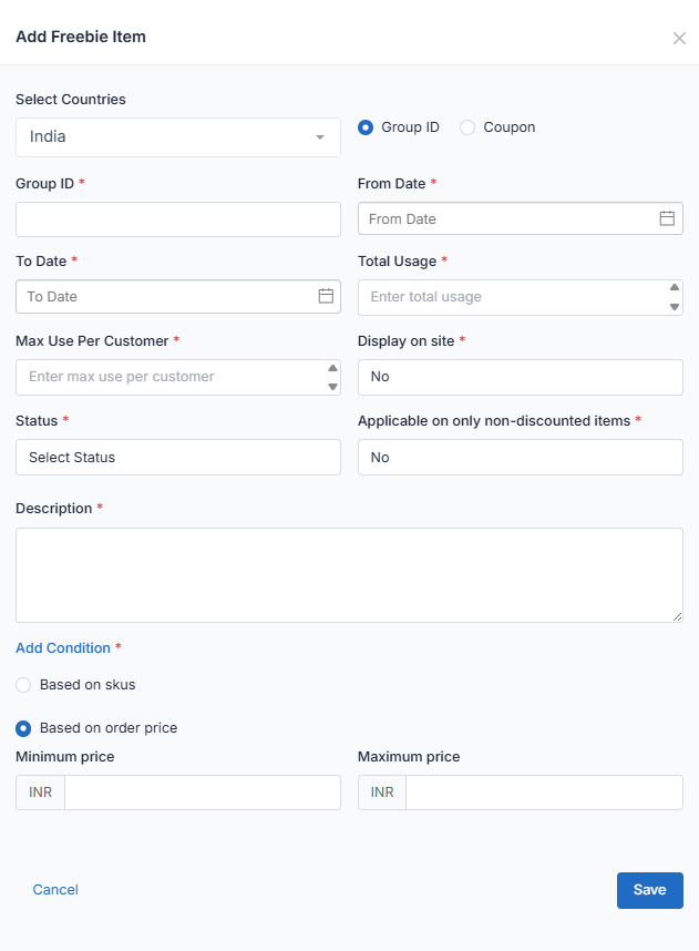 To add Freebies, go to “Promotions >> Cart Booster >> Freebie Item”