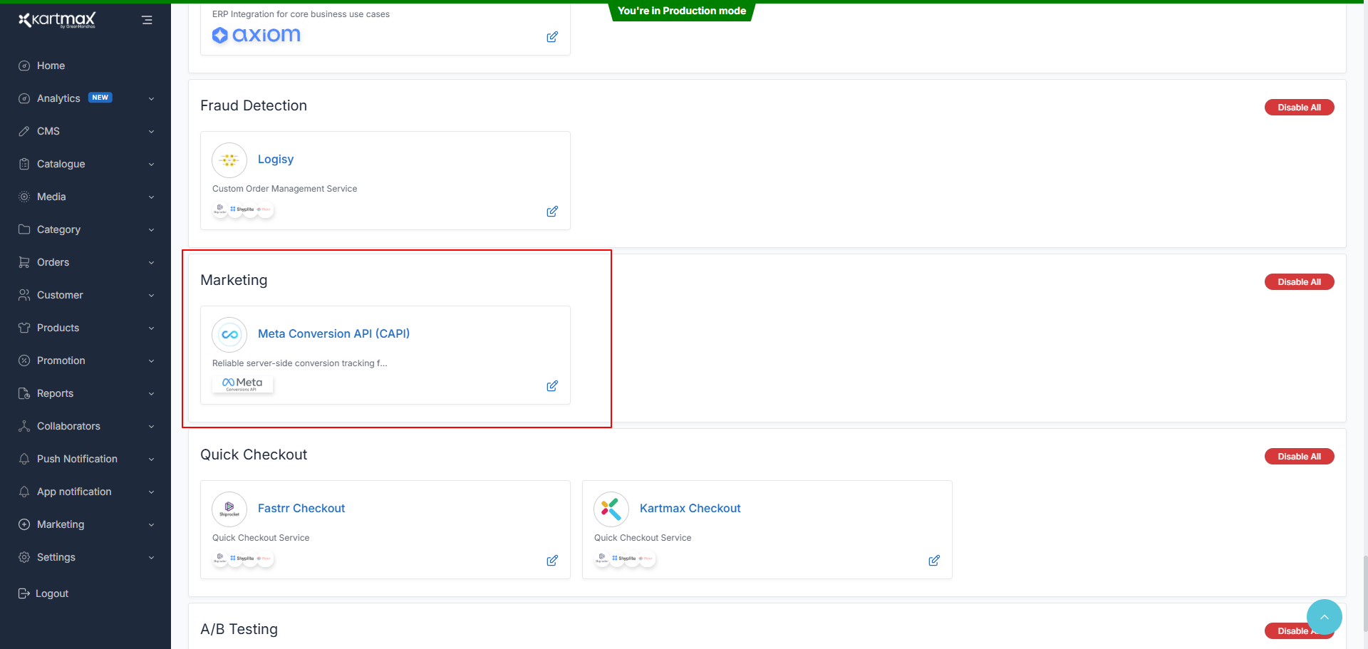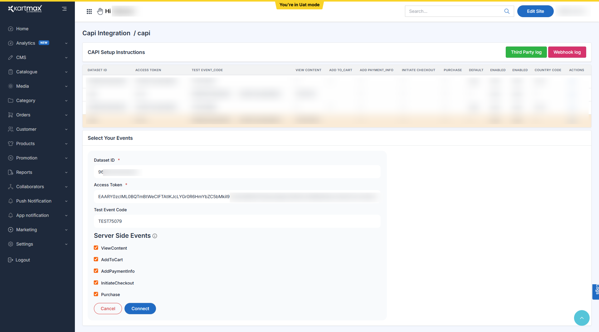 You can now configure Meta CAPI directly from the Kartmax admin by providing required credentials and selecting the events to be sent from the server.
